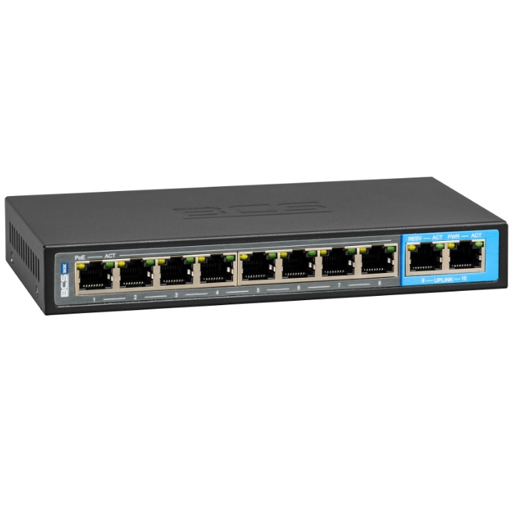 BCS-B-SP08G02G 8-PORT POE 10/100/1000Mbps + 2 UPLINK 10/100/1000Mbps DESKTOP POE SWITCH > 8 θύρες POE 10/100/1000Mbps > 2 θύρες Uplink 10/100/1000Mbps > Υποστηρίζει τα πρωτόκολλα 802.3af / 802.3at > Packet forwarding: 14.8Mbps > Capacity: 20Gbps >