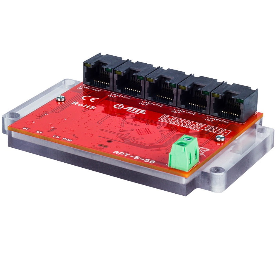 ATTE APT-5-50 5-PORT POE SWITCH EXTENDER 10/100/1000Mbps 1xPOE IN 4xPOE OUT(INPUT:PASSIVE POE ή 802.3af/at/bt) Το module APT-5-50 είναι ένα unmanaged gigabit PoE switch το οποίο λειτουργεί ως "ενεργό splitter". Είναι κατασκευασμένο να λειτουργεί με οπ