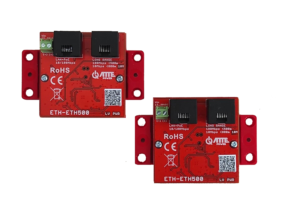 ATTE ETH-ETH500-SET EXTENDER LAN+POE 100Mbps/500m 10Mbps/800m(INPUT:PASSIVE POE ή 802.3at/af/bt) Το module ETH-ETH500-SET είναι ένα set από converters που μπορεί να επεκτήνει την εμβέλεια ενός δικτύου μέσω POE έως και 800m χρησιμοποιώντας ένα καλώδιο U