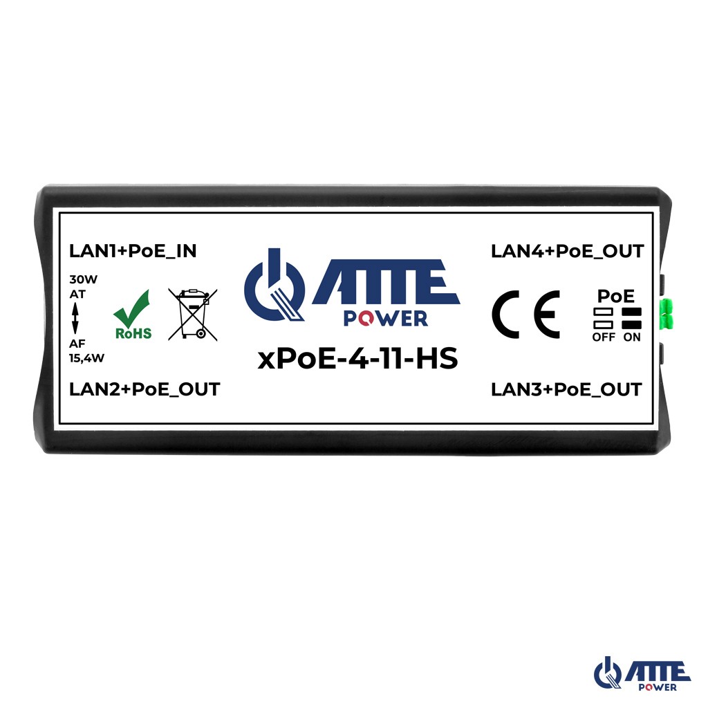 ATTE xPOE-4-11A-HS 4-PORT POE SWITCH EXTENDER 10/100Mbps(INPUT:PASSIVE POE ή 802.3af/at/bt) > 4 θύρες RJ45 10/100Mbps(auto MDI-MDIX, auto-negotiation) > 1 είσοδος LAN+PoE IN > 3 έξοδοι LAN+PoE OUT > Πρωτόκολλο POE LAN1(PoE IN): αυτόματο 802.03af ή 8