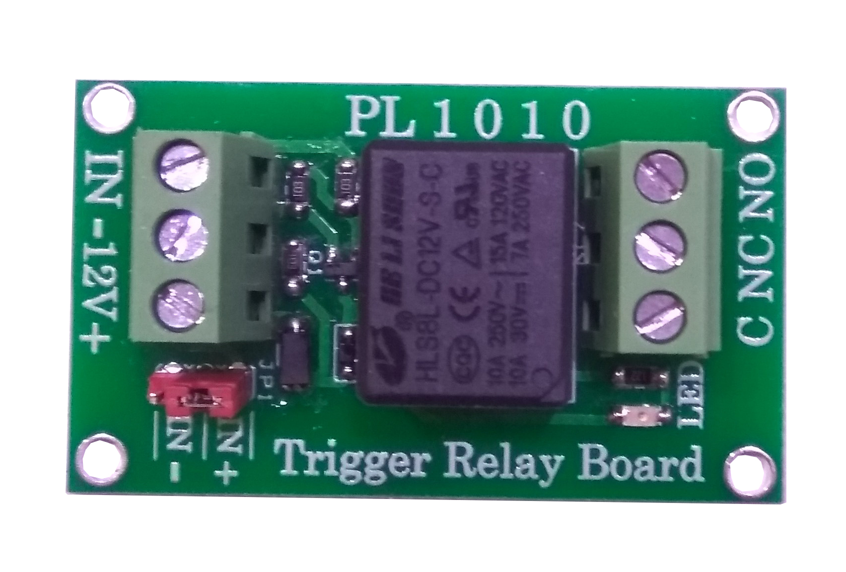 PL1010 ΜΟΝΑΔΑ ΡΕΛΕ ΜΕ TRIGGER > Μονάδα ρελέ η οποία μπορεί να ενεργοποιηθεί με δύο τρόπους. > Λειτουργίες: 1) IN+: Δίνετε μόνιμα τροφοδοσία, σε κανονική λειτουργία είναι απενεργοποιημένο και όταν δίνετε θετική εντολή ενεργοποιείται για όσ