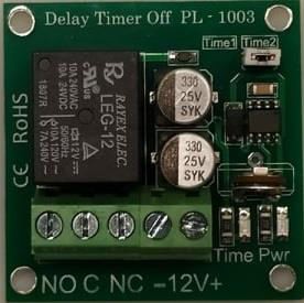 PL1003 DELAY TIMER OFF - ΡΕΛΕ ΧΡΟΝΟΚΑΘΥΣΤΕΡΗΣΗΣ 0-4min Τρόπος λειτουργίας: Τροφοδοτείται με τάση 12VDC και από την στιγμή που τροφοδοτείται οπλίζει το Relay και αρχίζει να μετράει τον χρόνο που του έχουμε ορίσει με το ποτενσιόμετρο. Όταν περάσει ο χρ