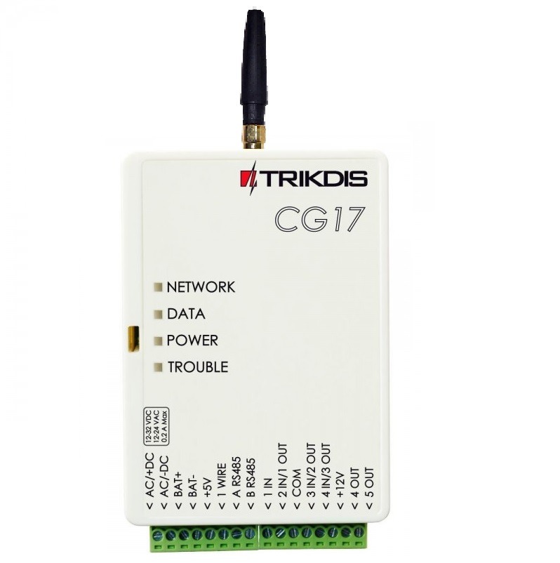 TRIKDIS CG17 KIT ΜΕ ΚΕΡΑΙΑ STICK > Πλαστικό κέλυφος για γαλβανική απομόνωση > 2 έξοδοι ανοικτού συλλέκτη > 1 είσοδος: NC,NO,EOL > 3 επαφές ρυθμιζόμενες είτε σαν είσοδοι(NC,NO) είτε σαν έξοδοι(OC) > Είσοδος 1-wire για σύνδεση αισθητηρίων θερμοκρασία